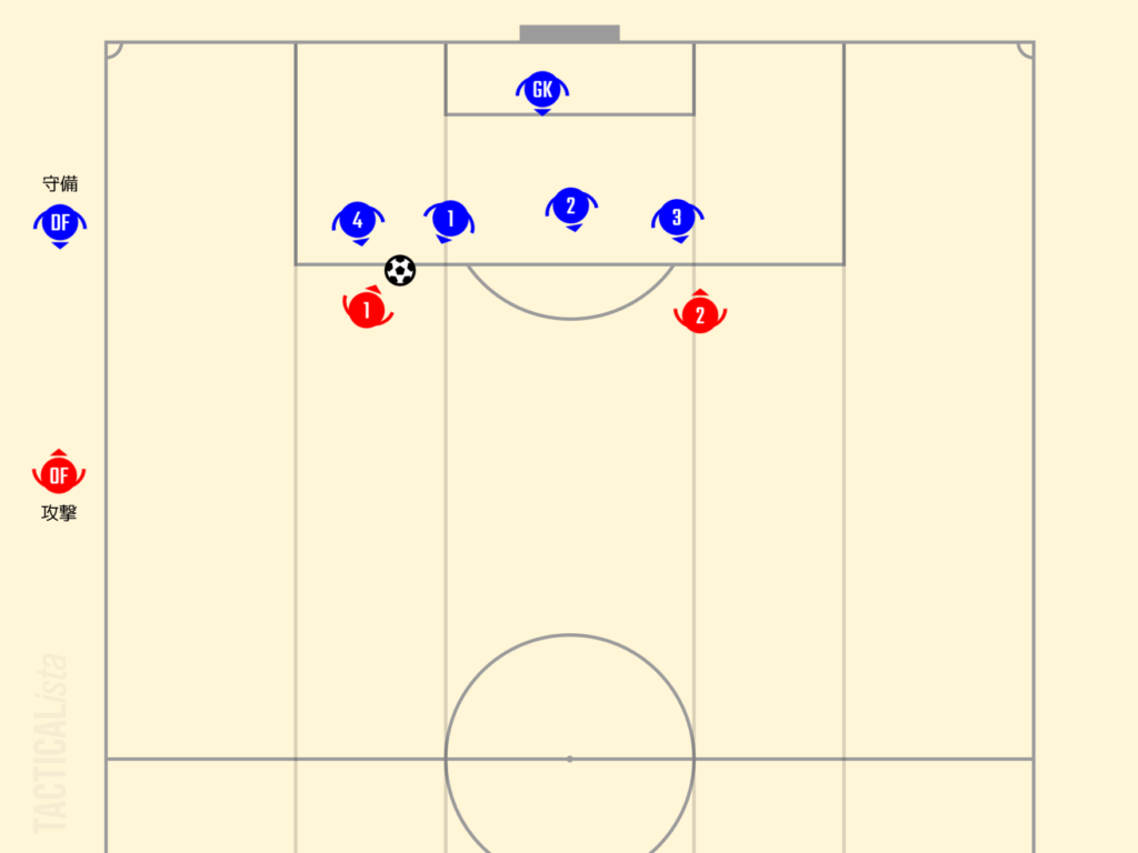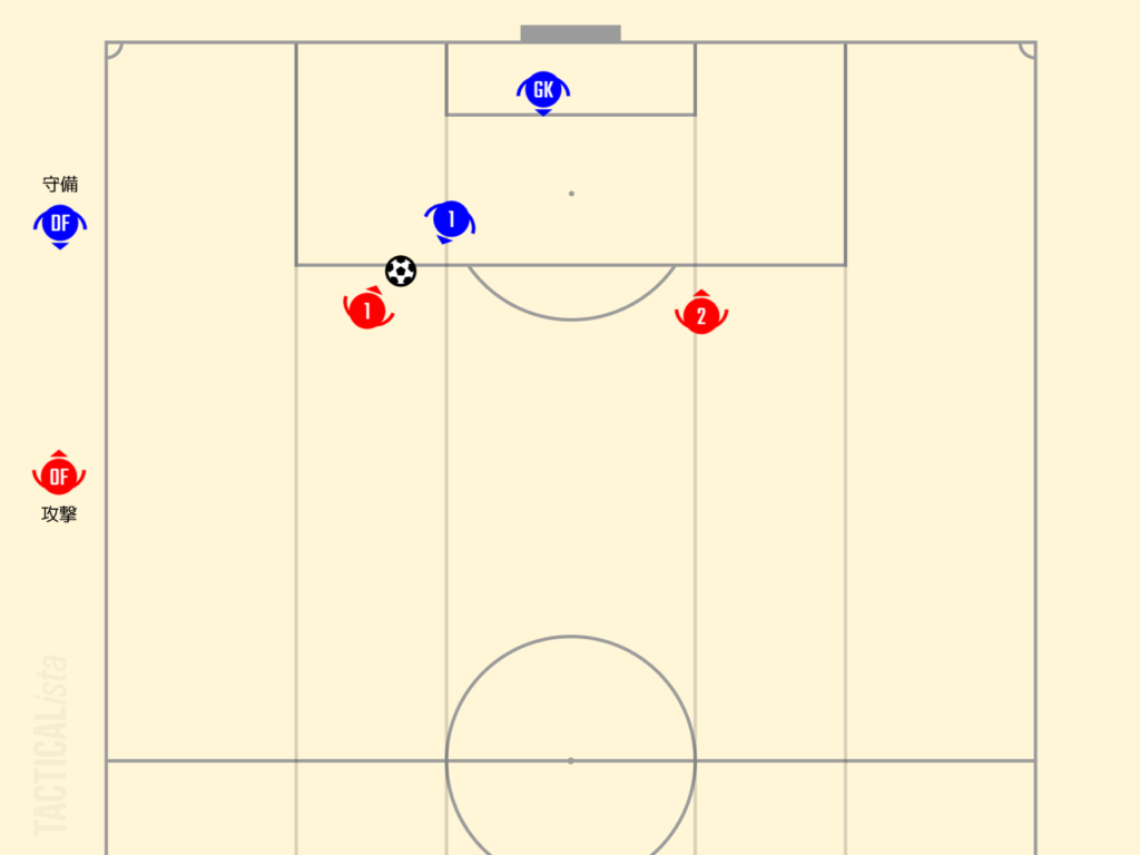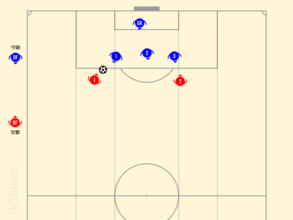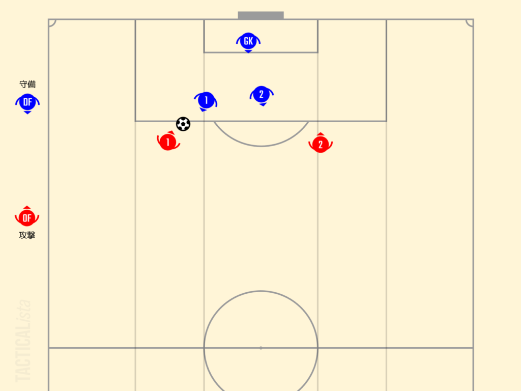 相手ゴール前で赤2の選手がフリーの2対1の状況